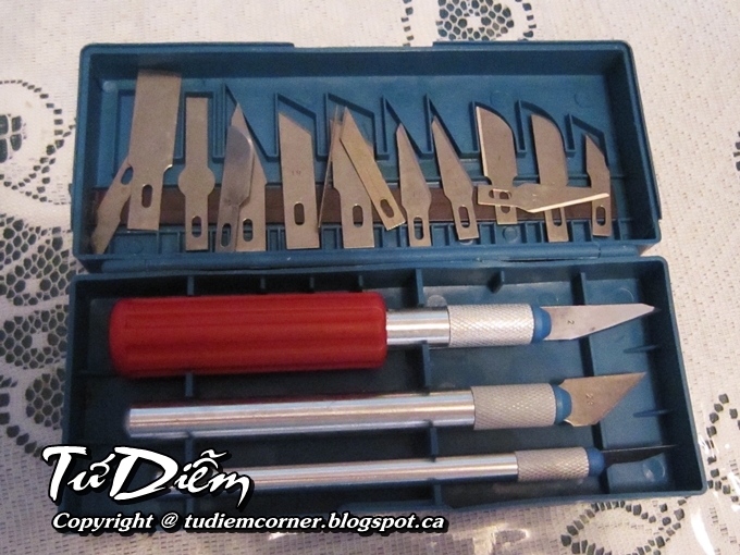 Bộ dao nầy có nhiều loại lưỡi rất sắc nhọn, giúp ích khi cần chạm khắc, cắt tỉa những hình ảnh đường nét tỉ mỉ. Tứ Diễm còn dùng bộ dao nầy chạm trổ những kiểu theo ngẫu hứng trên foam, giấy cứng, vv.. vv.. vv..