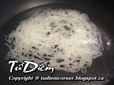 Sẵn tiện, Tứ Diễm làm thêm một thử nghiệm khác nữa.   Các sợi bún ép và hấp chín trong xửng xong thay vì đem ăn ngay, Tứ Diễm để dành lại một số để cho các sợi bún khô từ từ