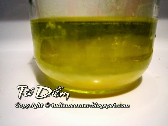 Tứ Diễm dùng kết hợp cả dầu Olive và Canola oil. Tuy nhiền vì lười không đong kỹ nên Tứ Diễm cho hơi nhiều dầu hơn 1/2 cup, nhưng vẫn có thể đánh thành Mayonnaise. Chờ một chút để lòng đỏ lắng xuống nằm ở dưới đáy lọ thủy tinh.